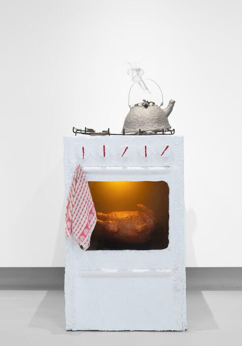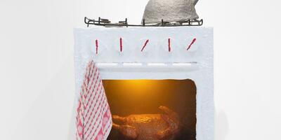 Corre Limpia Barre 2, 2025; Cartón, madera, papel maché, sistema eléctrico, foco, maquina de humo, viruta, huevos de codorniz, alambre, rata de juguete, pintura acrílica, pintura sintética y látex, repasador, acrílico y corchos
